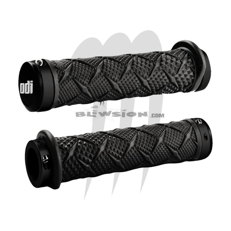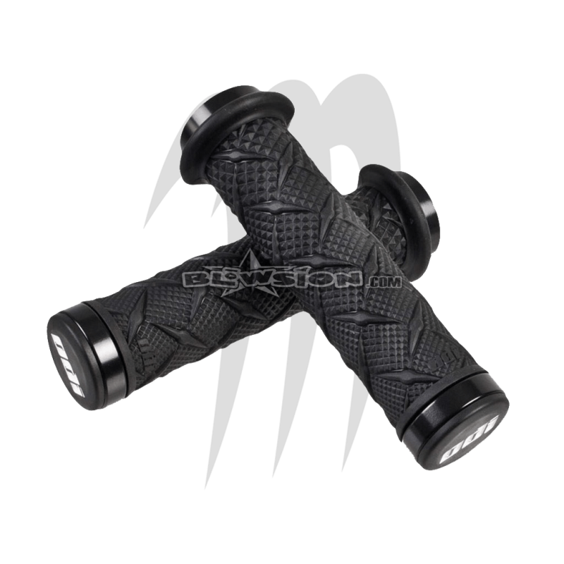 Black Xtreme Grips de ODI. Disponible exclusivement par Blowsion uniquement. Les kits de démarrage sont livrés avec des pinces de verrouillage ODI noires et les nouveaux embouts ODI. Ces nouvelles poignées chaudes présentent un motif de moletage conique plus large et plus profond là où vous avez besoin de plus de traction. Le plus grand motif en losange est surélevé sur la surface supérieure pour encore plus de contrôle. Le diamètre moyen du X-treme offre un amortissement optimal tout en restant suffisamment petit pour tenir facilement, réduisant ainsi la pompe à bras. La poignée comporte également une bride de style «prédécoupée» exclusive à ODI, qui est juste assez grande pour indiquer facilement la position de votre main, mais ne gêne pas les manettes des gaz ni les manettes de réglage. Les anneaux noirs Lock-On garantissent une installation facile et des performances sans glissement!