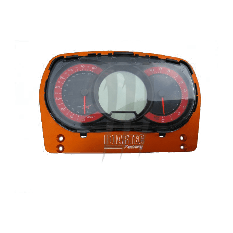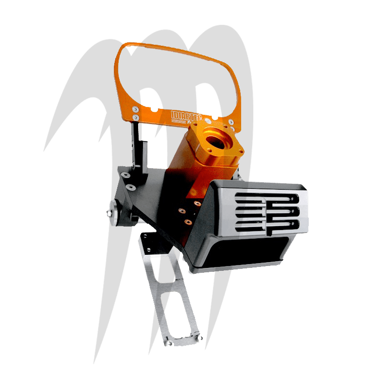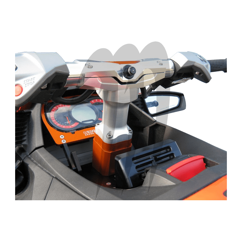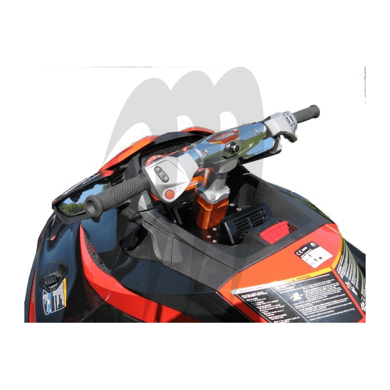 Platine Seadoo RXP 260 compétition offshore en aluminium anodisé noir et orange avec palier à double roulements en acier inoxydable. Position du palier porte axe de direction réglable en inclinaison; 3 positions pour avoir une meilleure position de pilotage dans des conditions extrêmes avec des colonnes rigides ou amorties hauteur 160 ou 230 mm. Le cadre en aluminium anodisé orange est prévu pour recevoir l’écran du tableau de bord d’origine.